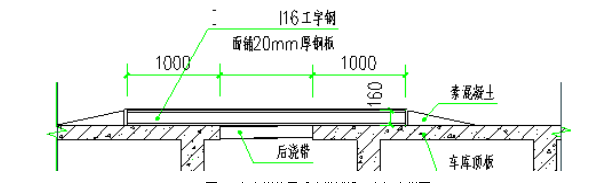 本项目车库与主楼间设置沉降后浇带,车库各区域间设置伸缩后浇带,车库进行分段施工,后浇带部位外挑长度0.5-2m。后浇带宽均为800mm,故在行车道位置拟用16#工字钢架设在后浇带上以便过车(附图2)。